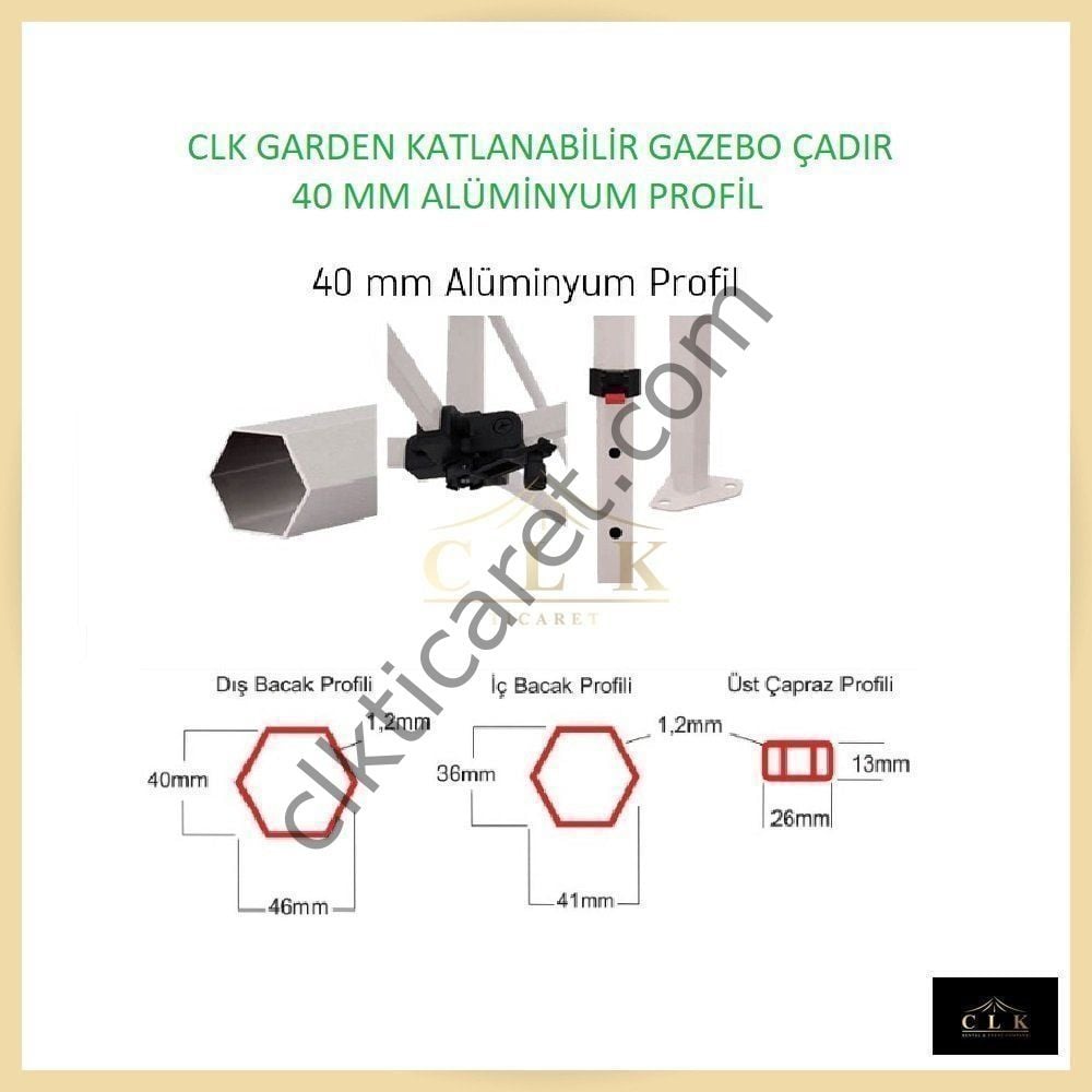 İmalatçı firma CLK TİCARET güvencesi ile %100 su geçirmez Oxford kumaş ile üretilmiş, branda ve 40 mm alüminyum iskelet ve mafsal parçaları garantili katlanabilir gazebo çadırları.