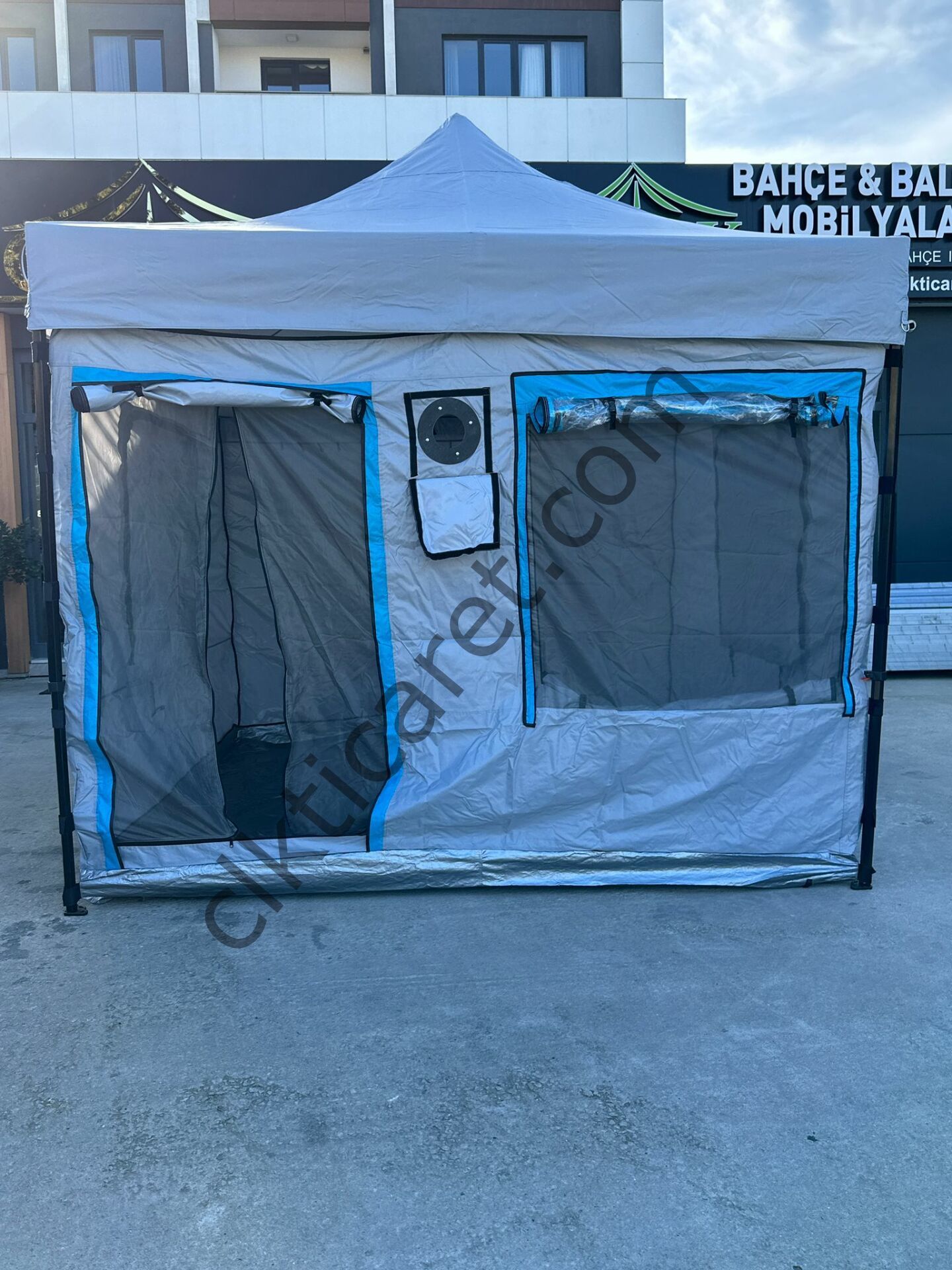 CLK 3x3 30 mm Profil Katlanır Gazebo Portatif Kamp Çadır Açık Gri Mavi Detaylı