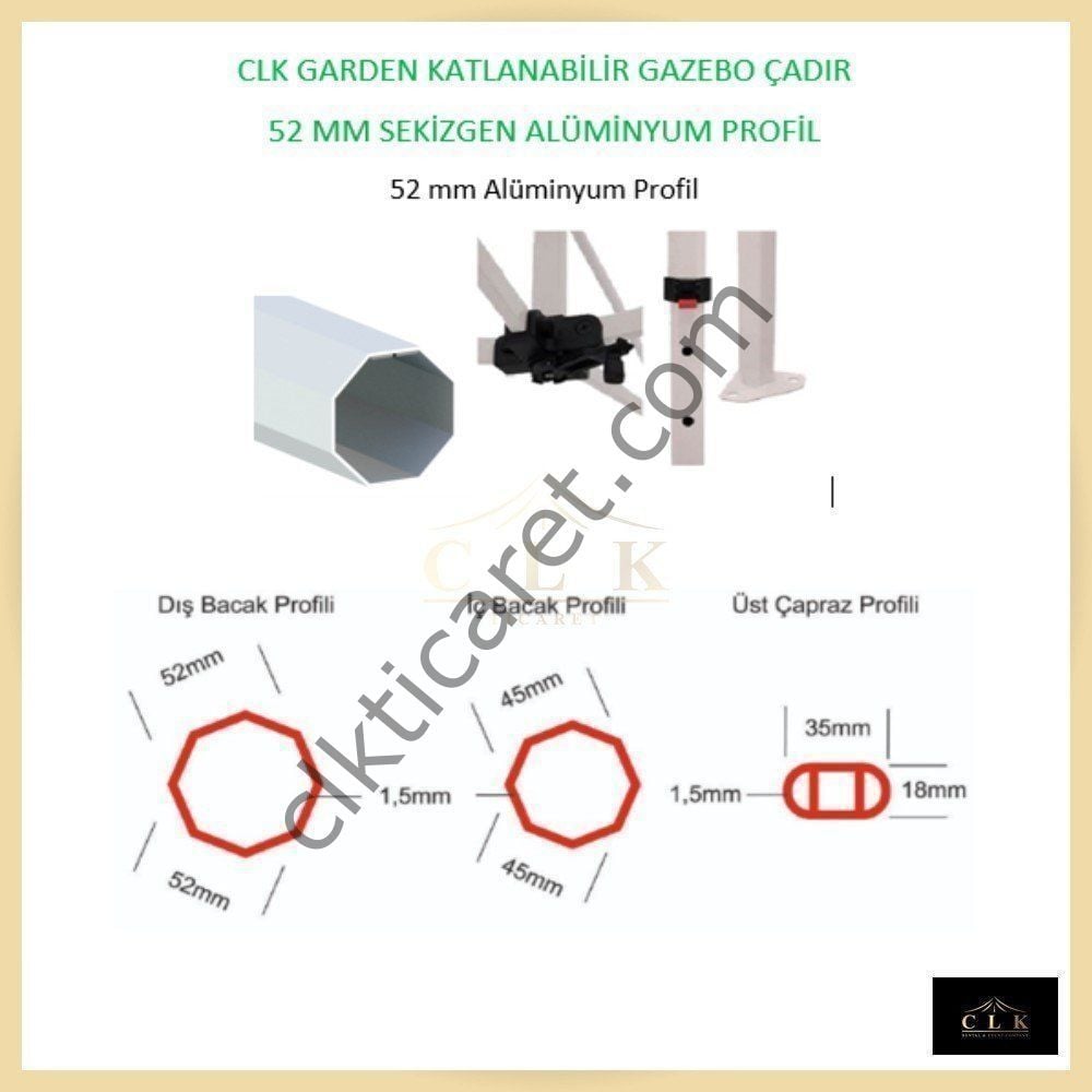 İmalatçı firma CLK TİCARET güvencesi ile su geçirmez, yüksek kalite kumaş ile üretilmiş, branda ve 52 mm sekizgen alüminyum iskelet ve mafsal parçaları garantili katlanabilir gazebo çadırları.