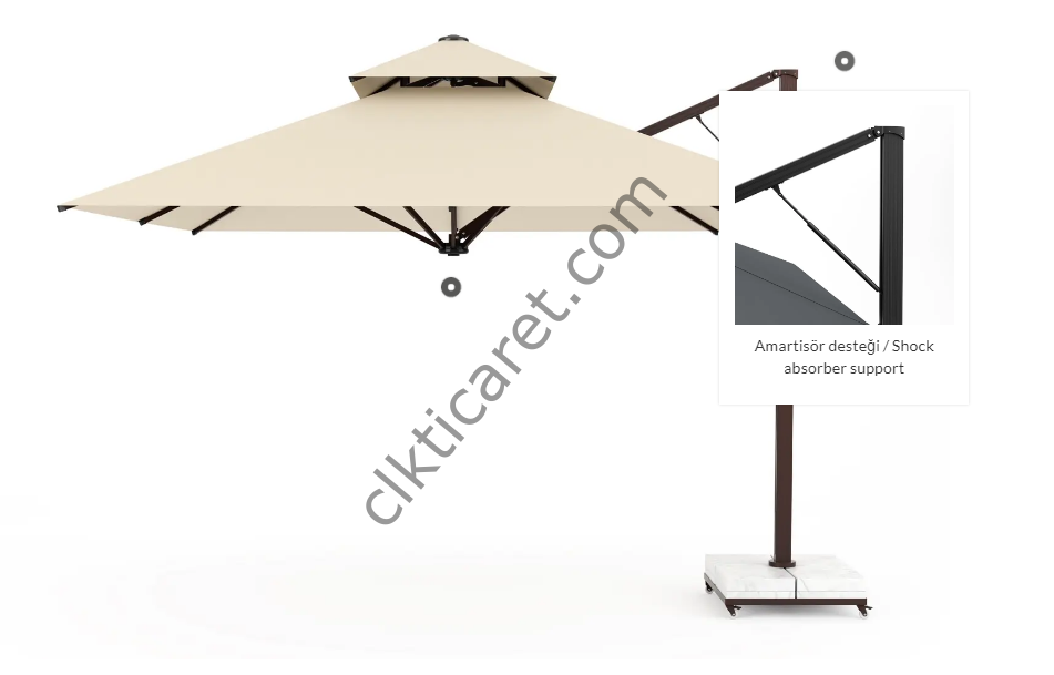 CLK 4x4 mt Şemsiye Albatros kuşunun geniş kanatlarından esinlenerek üretilen Albatros şemsiye, yandan gövdeli yapısı ile kesintisiz bir şekil de 16 m2’lik konforlu bir gölge alanı sağlar. Sahip olduğu System X ve amortisör desteği ile kolaylıkla açılıp kapatılabilir. Zemin kısmındaki özel mekanizma ile kendi ekseni etrafında 360 º dönebilme kabiliyetiyle şemsiyenizi hareket ettirmeden kolaylıkla farklı alanları gölgeleyebilirsiniz. Tepe kısmında bulunan hava tahliye kulesi ile rüzgar salınımı minimuma indirgenmiştir. Dış mekana uyumlu opsiyonel kompakt dekoratif kapak seçeneği ile şemsiyeniz bulunduğu mekan ile bütünlük sağlar.
