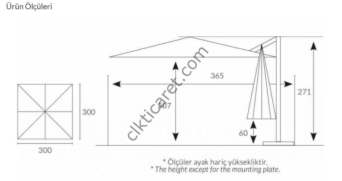 CLK Mykonos yandan kollu şemsiye 55 X 80 mm ana taşıyıcı direk ve 17 X 25 mm kollardan oluşan CLK Mykonos yandan kollu şemsiyemiz , yandan direkli olması sayesinde güneşten ve olası yağmurlardan koruduğu 9 m2 alanı en konforlu biçimde kullanılmasını sağlamaktadır.