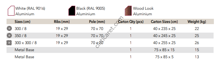 Şemsiye Boru Renk Seçenekleri : Beyaz (RAL 9016) Alüminyum | Siyah (RAL 9005) Alüminyum | Ahşap Görünüm Alüminyum | Gümüş Eloksallı Alüminyum