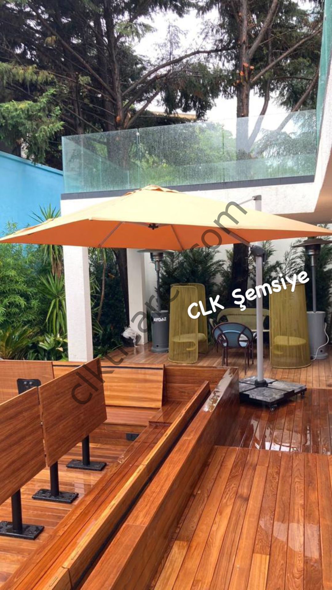 CLK Garden Mykonos Şemsiye 55 X 80 mm ana taşıyıcı direk ve 17 X 25 mm kollardan oluşan CLK yandan kollu şemsiyemiz , yandan direkli olması sayesinde güneşten ve olası yağmurlardan koruduğu 9 m2 alanı en konforlu biçimde kullanılmasını sağlamaktadır.