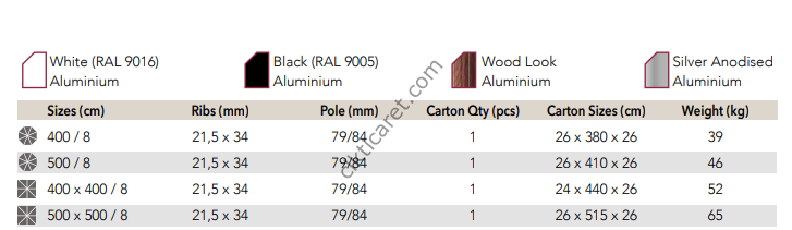 Şemsiye Boru Renk Seçenekleri : Beyaz (RAL 9016) Alüminyum | Siyah (RAL 9005) Alüminyum | Ahşap Görünüm Alüminyum | Gümüş Eloksallı Alüminyum
