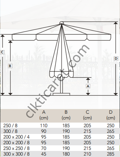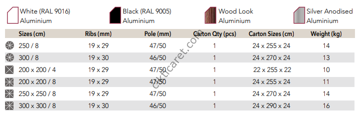 Şemsiye Boru Renk Seçenekleri : Beyaz (RAL 9016) Alüminyum | Siyah (RAL 9005) Alüminyum | Ahşap Görünüm Alüminyum | Gümüş Eloksallı Alüminyum